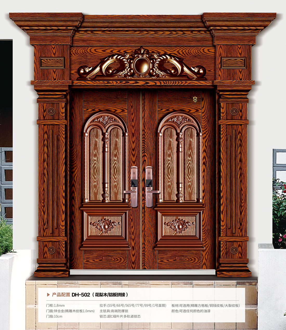 产品名称:精雕铝板拼接门 产品编号:DH-502(花梨木/铝板拼接)