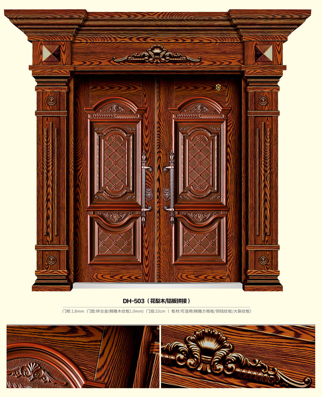 产品名称:精雕铝板拼接门 产品编号:DH-503(花梨木/铝板拼接)
