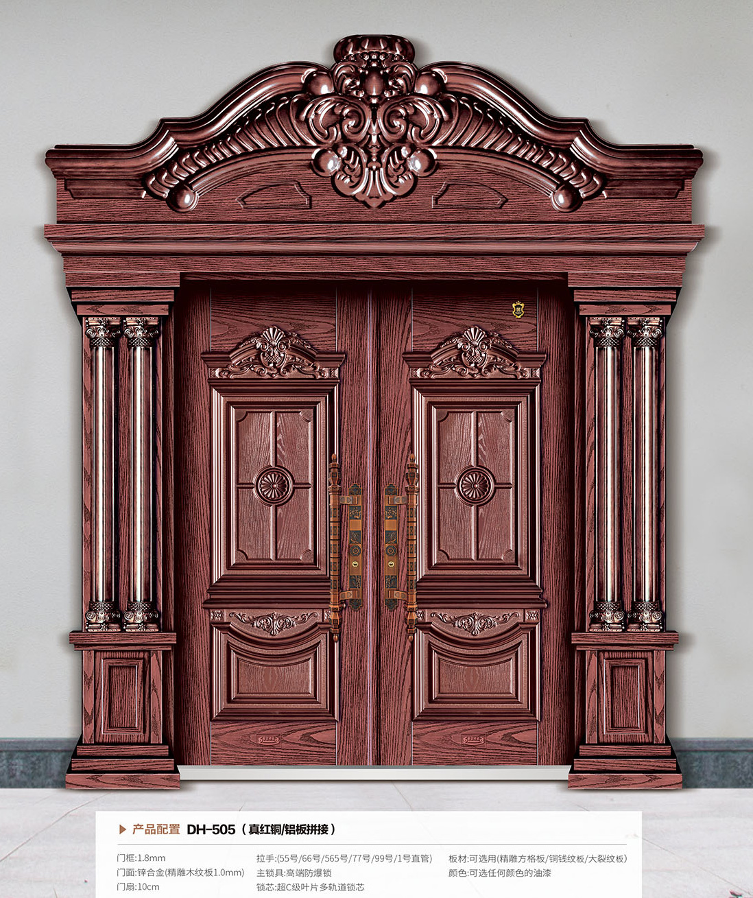 产品名称:精雕铝板拼接门 产品编号:DH-505(真红铜/铝板拼接)