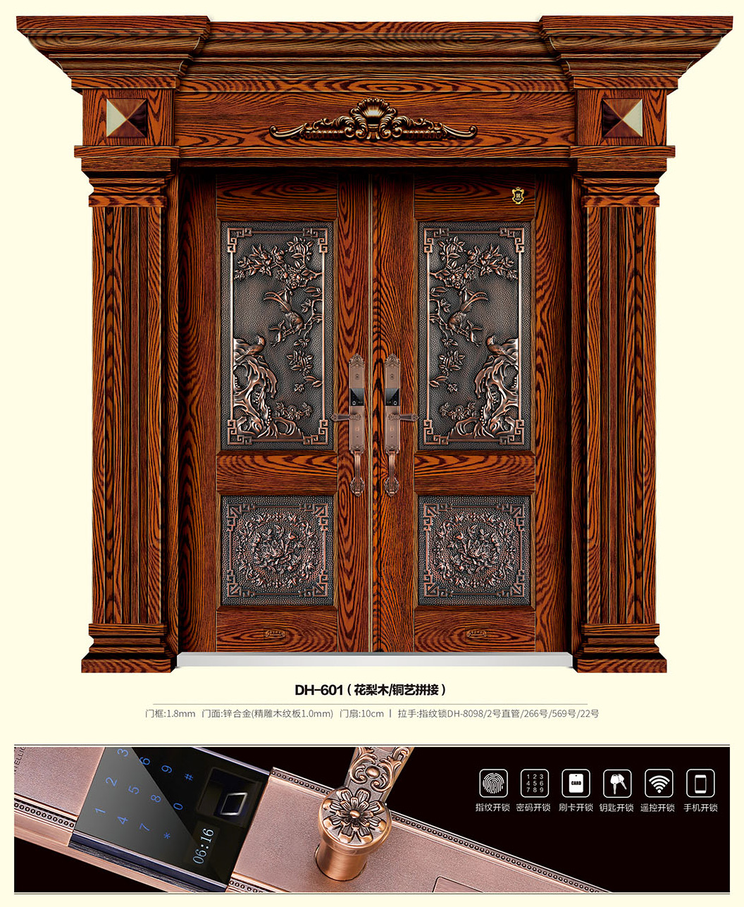 产品名称:精雕铜艺拼接门 产品编号:DH-601(花梨木/铜艺拼接)
