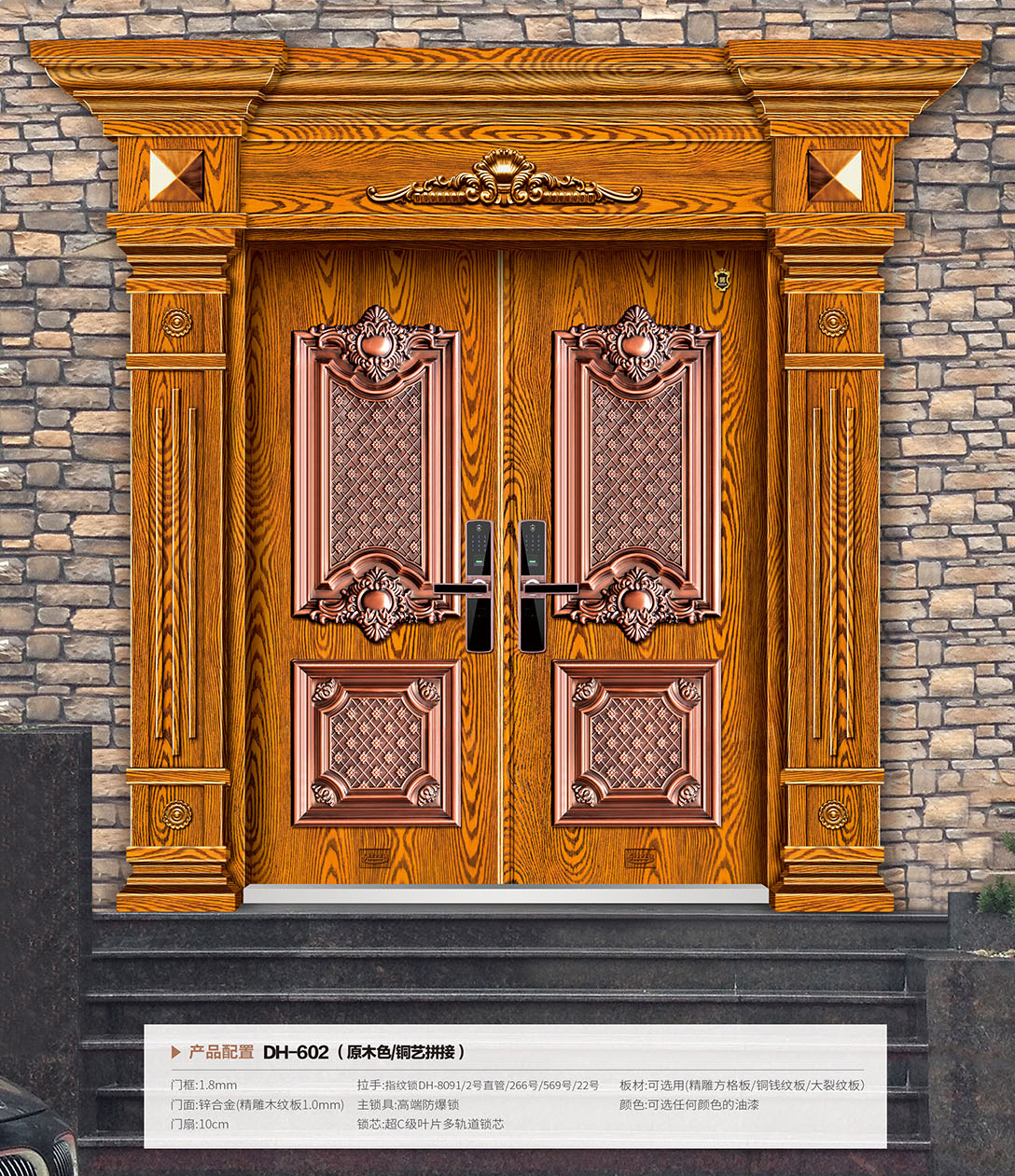 产品名称:精雕铜艺拼接门 产品编号:DH-602(原木色/铜艺拼接)