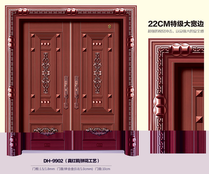 产品名称:超高带窗拼接门 产品编号:DH-9902(真红铜/拼花工艺)