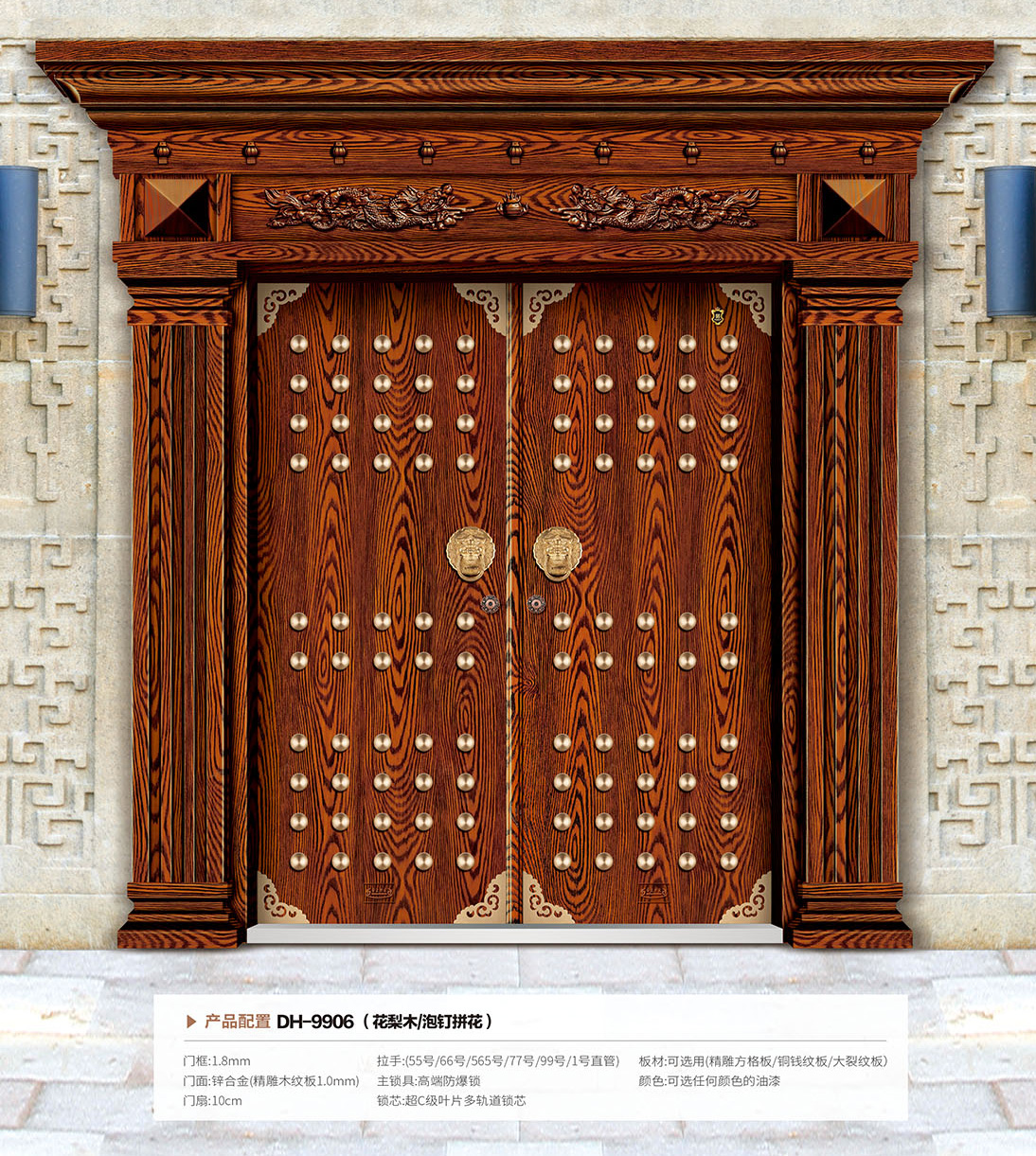 产品名称:泡钉拼花门 产品编号:DH-9906(花梨木/泡钉拼花)